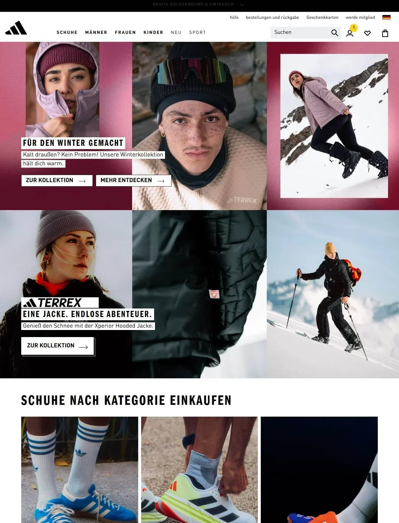 Adidas verwendet aussagekräftige Produktfotos in einer klaren Anordnung, sowie keine Accentfarben. Texte, Hintergründe und Buttons sind schwarz/weiß.